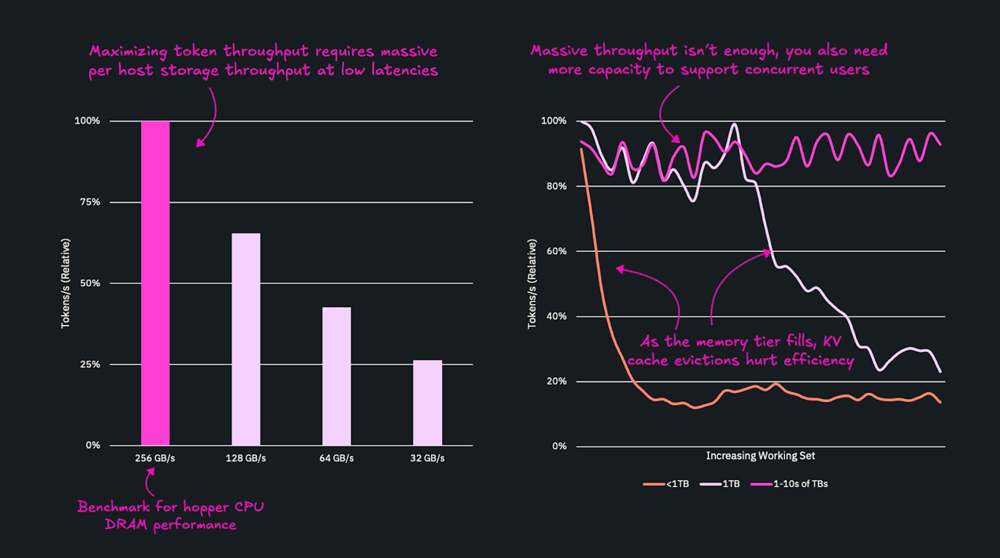 DRAM is the most common memory tier, it’s fast, but often not large enough to retain growing working sets at high concurrency. When context can’t be fetched quickly or kept resident, GPUs stall or trigger repeated prefills, reducing throughput and increasing latency.